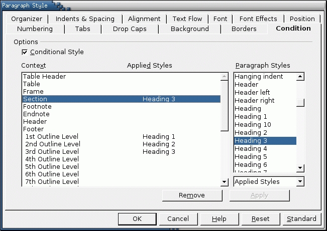 However, these goals can be accomplished equally well by applying multiple styles. Probably the most common use for conditional formatting is with single style outlining. Single-style outlining is a type of outline numbering designed with a Numbering style, rather than with Tools -> Outline numbering. Instead of using different styles, it changes the number formatting whenever you press the Tab key to create a subordinate heading.