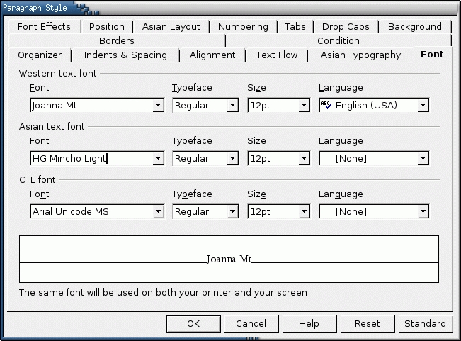 Enable Asian languages support in Tools -> Options -> Language Settings -> Languages suddenly gives you two new tabs for paragraph formatting: Asian Layout and Asian Typography. These two tabs, which really could be merged into one, are used for Japanese, Korean and Chinese characters. The Asian Layout tab sets up Japanese double-line characters. The Asian Typography tab activates use of the lists of forbidden characters for the start and end of lines set in Tools -> Options -> Language Settings -> Asian Settings, the use of hanging characters and the spacing between different sets of characters.