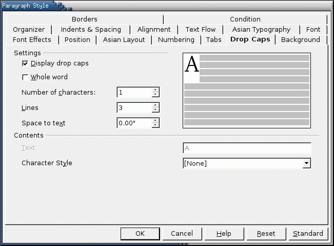 The Drop Caps tab automates the use of drop caps and gives a preview of the settings. The tab only available only for styles, not for manually formatted paragraphs.