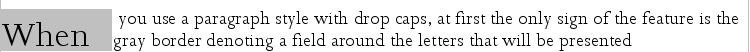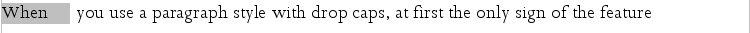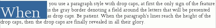 When you use a paragraph style with drop caps, at first the only sign of the feature is the gray border denoting a field around the letters to be presented as drop caps. Be patient. As you type, the drop caps gradually assume their full size and position. When the paragraph's number of lines reaches the height of the drop caps, the drop caps finally are revealed in all their glory and your document has a small touch of elegance.