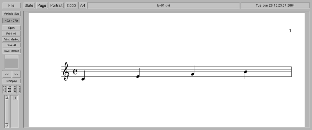 The new elements include a header block, further specifications for rhythm and pitch, a specifier for a double-bar and directives for MIDI output (with tempocontrol) and LilyPond's default print-ready formats. Figure 2 displays the compiled output, again in the GhostView PostScript file viewer.