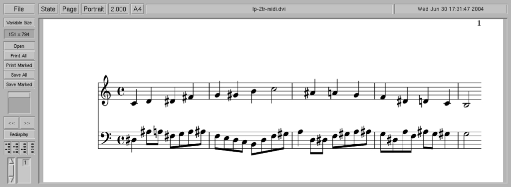 Figure 4 illustrates the results from the conversion of a simple 2-track MIDI sequence. Notice that in the second measure of the upper staff there is a misaligned half-note. The notation is supposed to be two-tied quarter notes, easy enough to repair with a little manual correction. Figure 5 displays the corrected score, with header information (title, author, date) and a cautionary accidental added to the final G in the lower staff.