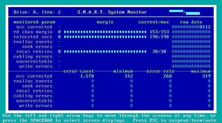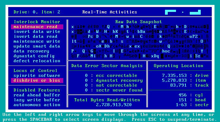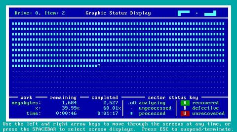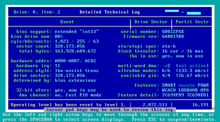 You can suspend or cancel any operation and resume later from where you left off. SpinRite 6.0 reports progress as a percentage with four decimal places; you can note exactly where you left off and resume later. Because drives are big and getting bigger, and because the time to run SpinRite 6.0 can be considerable, this feature lets you examine the drive progressively, over several sessions, if necessary.