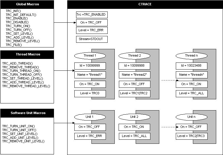 CTrace keeps flags indicating if tracing is turned on or not and which level(s) are set. There is a separate set of flags for each of the following scopes: global, thread and software unit. When a trace output macro is called, CTrace checks to see if any of these flags are set. If the answer is yes, the trace is written to the output stream. There are a number of macros to facilitate the toggling of these flags at runtime to finely tune the trace output. Figure 1 shows the macros and the corresponding data structures on which they act.