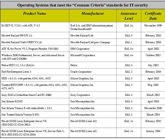 Table 1, below, lists all operating systems that have been evaluated, as taken from the complete and official list of all evaluated software products. As you can see, Linux shares space with some prestigious software.