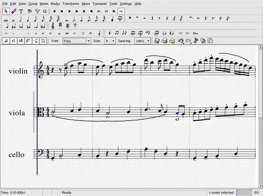 The ability to enter music in standard notation always has been central to Rosegarden's design. Rosegarden does not pretend to provide a complete notation editing environment in the manner of Finale or Sibelius, but its notation editor supplies most common Western music notation symbols and directives, facilitating the creation of basic conventional scores. When your work is ready, Rosegarden can export your notation data in the Mup and MusicXML formats and, of course, LilyPond too.
