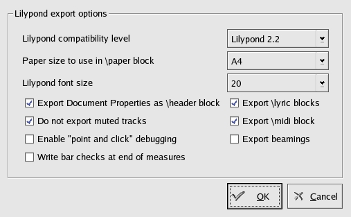 Let's open Rosegarden's File/Export dialog to save the example in Figure 1 as a LilyPond file named lj-test-01.ly. During the export process, the LilyPond options dialog seen in Figure 2 opens. After setting our preferences, click on the OK button to complete the export.