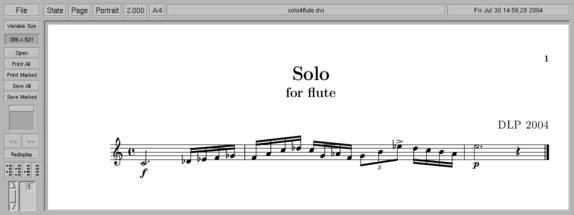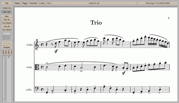 Figure 8 shows Denemo at work. You can see the display is not completely WYSIWYG, but it is quite comprehensible. Indicators such as the tuplet figures are translated to their correct appearances when the output file is compiled by LilyPond, as illustrated in Figure 9. A bug in Denemo prevented the dynamics indicators from being displayed in Denemo itself, but they are entered correctly in the LilyPond output. The title and author information is entered in Denemo's File/Set Headers dialog.