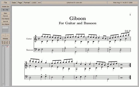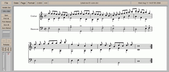 Figure 4 shows NoteEdit's main display with two staves prepared for guitar and bassoon. I exported this work as a LilyPond file named lp-test-ne.ly. I then processed it with the LilyPond binary. The screenshot in Figure 5 is NoteEdit's LilyPond options dialog, similar to what we saw in Rosegarden. I clicked the Start Export button in that dialog, and voilá, I had a new LilyPond file from NoteEdit. Alas, my versions of NoteEdit and LilyPond were not in sync, so I used the convert-ly utility to bring the file format up to date. See last month's installment of this article for details on how to do that. Next, I ran this familiar command sequence lilypond lj-test-ne-converted.ly to create the PostScript output seen in Figure 6. Obviously, a little manual touch-up is required; Figure 7 demonstrates the results after some manual edits to the LilyPond file.