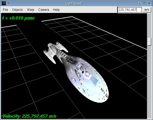 In terms of high performance, nothing beats the speed of light, at least not without some strange matter or access to a matter/anti-matter engine and some dilithium crystals. You can get that feeling by firing up your screensaver and selecting rocks if you are using xscreensaver or the OpenGL space in KDE's own list. How objects look as you approach the speed of light is a popular mainstay of science-fiction films, but generally speaking, we never get to see what it actually might look like. That was the inspiration behind Daniel Richard G.'s Light Speed!, a program designed to show precisely what happens to our view of an object as it approaches the speed of light. The program takes into consideration various relativistic effects, such as Lorentz contraction, red/blue Doppler shift, headlight effect and optical aberration. The About page on the Light Speed! Web site describes all these effects (see the on-line Resources).