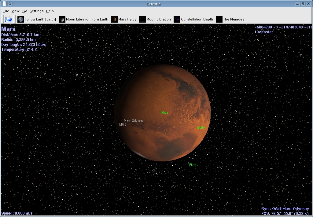 Celestia is a great program to sit back and explore and is well worth the download. Aside from stars and planets, you can visit spacecraft currently orbiting nearby worlds, such as the Mars Global Surveyor. Try heading for the spacecraft, click on Mars and then select follow (Figure 2). Now accelerate time. A number of major asteroids also are in the database if you'd prefer a trip to Eros.