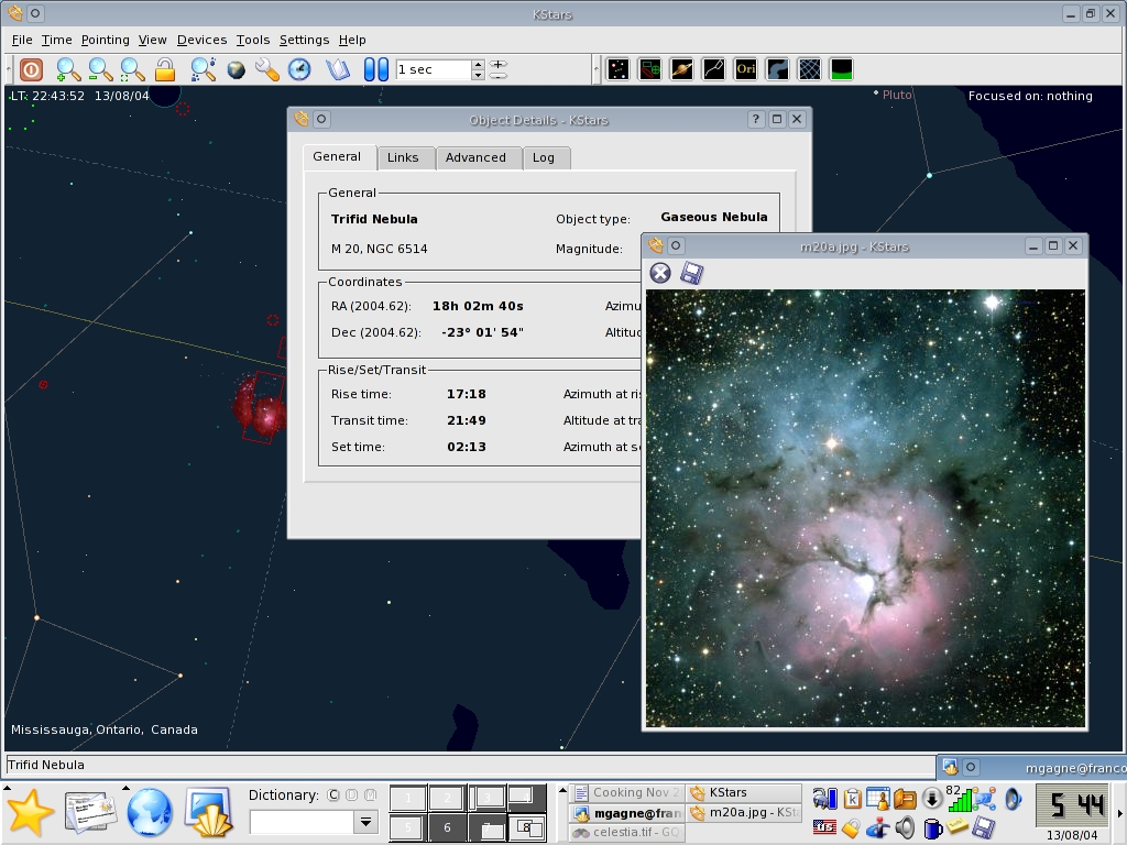 KStars is amazing fun but much more than a toy. With a database of the planets, 130,000 stars, 13,000 deep-sky objects, the planets and many asteroids, KStars is an astronomical treasure. With it, you visually can identify the position of stars, galaxies, nebulae and other glories of the night sky. You can control what is displayed, zoom in on objects and—I love this part—download images from on-line resources, such as the Hubble and the Space Telescope Science Institute. Simply right-click on an object of interest, and the pop-up offers you additional information and links to high-resolution images of those objects when appropriate. Figure 3 shows my KStars session pulling up information on the Trifid Nebula.
