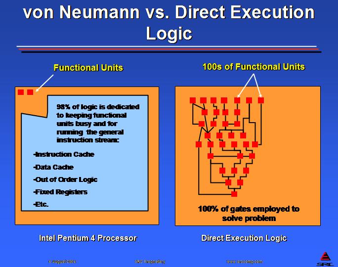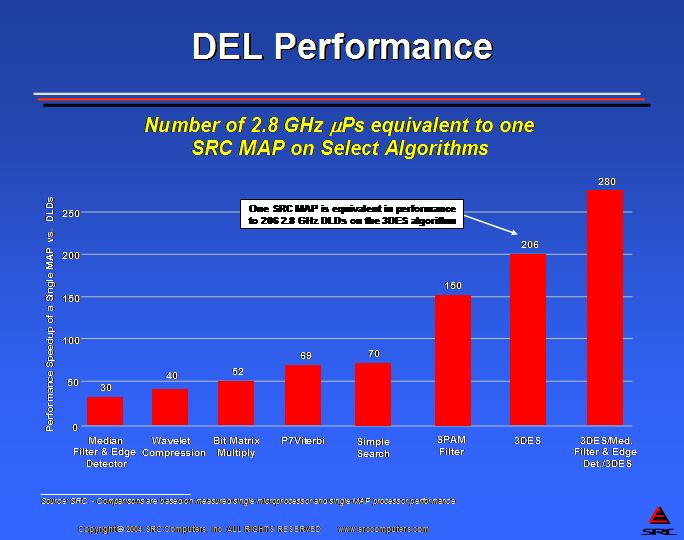 Even though a microprocessor can operate at a clock frequency of 3GHz and the FPGA chips operate in the 100–300MHz frequency range, the parallelism and internal bandwidth on a DEL processor can outperform the microprocessor by orders of magnitude better delivered performance. Figure 2 presents some benchmark comparisons between SRC's DEL processor, MAP, and a typical von Neumann instruction processor, the Intel Xeon 2.8GHz microprocessor. Parallel execution of exactly the required number of functional units, high internal bandwidth, elimination of instruction processing overhead and load/store elimination all contribute to overcoming the 30× difference in clock frequency between the MAP and the Intel microprocessor.