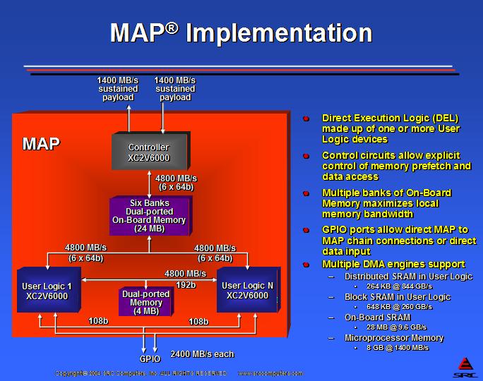 The patented MAP processor is SRC's high-performance DEL processor. MAP uses reconfigurable components to accomplish control and user-defined compute, data prefetch and data access functions. This compute capability is teamed with very high on- and off-board interconnect bandwidth. MAP's multiple banks of dual-ported On-Board Memory provide 11.2GB/sec of local memory bandwidth. MAP is equipped with separate input and output ports with each port sustaining a data payload bandwidth of 1.4GB/sec. Each MAP also has two general-purpose I/O (GPIO) ports, sustaining an additional data payload of 4.8GB/sec for direct MAP-to-MAP connections or data source input. Figure 3 presents the block diagram of the MAP processor.