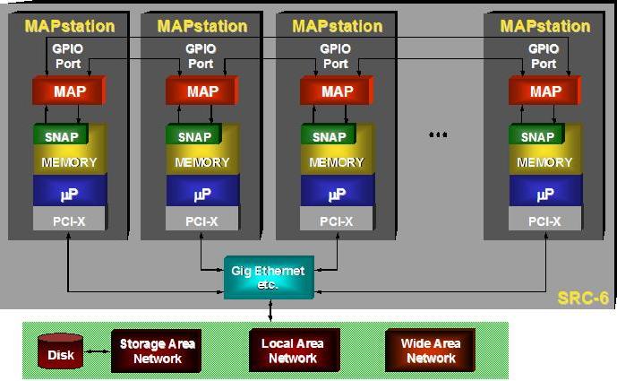The Dense Logic Devices (DLDs) used in these products are the dual-processor Intel IA-32 line of microprocessors. These third-party commodity boards are then equipped with the SRC-developed SNAP interface. SNAP allows commodity microprocessor boards to connect to, and share memory with, MAPs and Common Memory nodes that make up the rest of the SRC system.