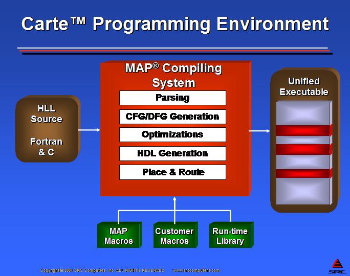 The SRC Carte programming environment was created with the design assumption that application programmers would be writing and porting applications to the RC platform. Therefore, the standard development strategies of design, code in high-level languages (HLLs), compile, debug via standard debugger, edit code, recompile and so on, until correct, are used to develop for the SRC-6 system. Only when the application runs correctly in a microprocessor environment is the application recompiled and targeted for the DEL processor, MAP.