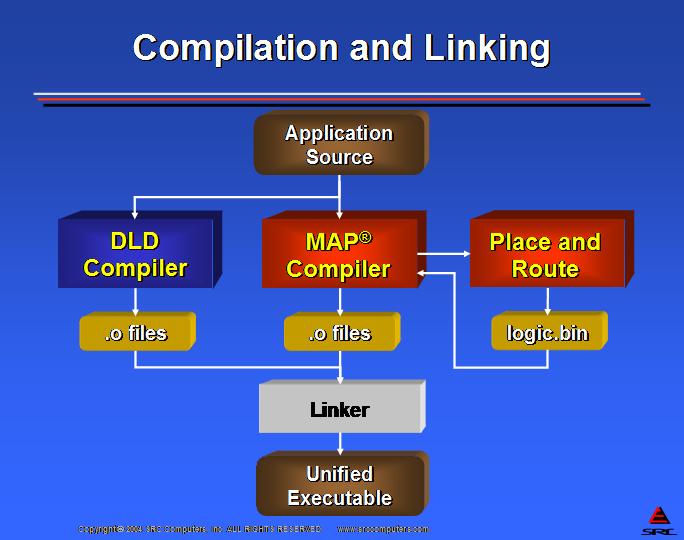 Compiling to hardware in an RC system requires two compilation steps that are quite foreign to programming for an instruction processor. The output of the HLL compiler must be a hardware definition language. In Carte, the output either is Verilog or Electronic Design Interchange Format (EDIF). EDIF files are the hardware definition object files that define the circuits that will be implemented in the RC chips. If Verilog is generated, then that HDL must be synthesized to EDIF using a Verilog compiler such as Synplify from Synplicity.