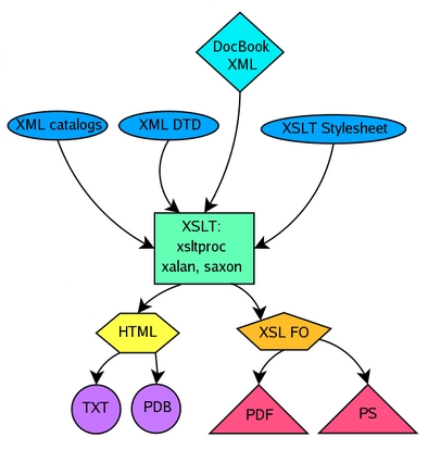 DocBook XML source is fed to the XSLT processor together with the XML DTD, XML catalog and XSLT stylesheet. From this combination, the XSLT processor makes either HTML, which can be converted to TXT or PDB, or XSL-formatted objects, which can be converted to PDF or PS by using FOP, discussed below.