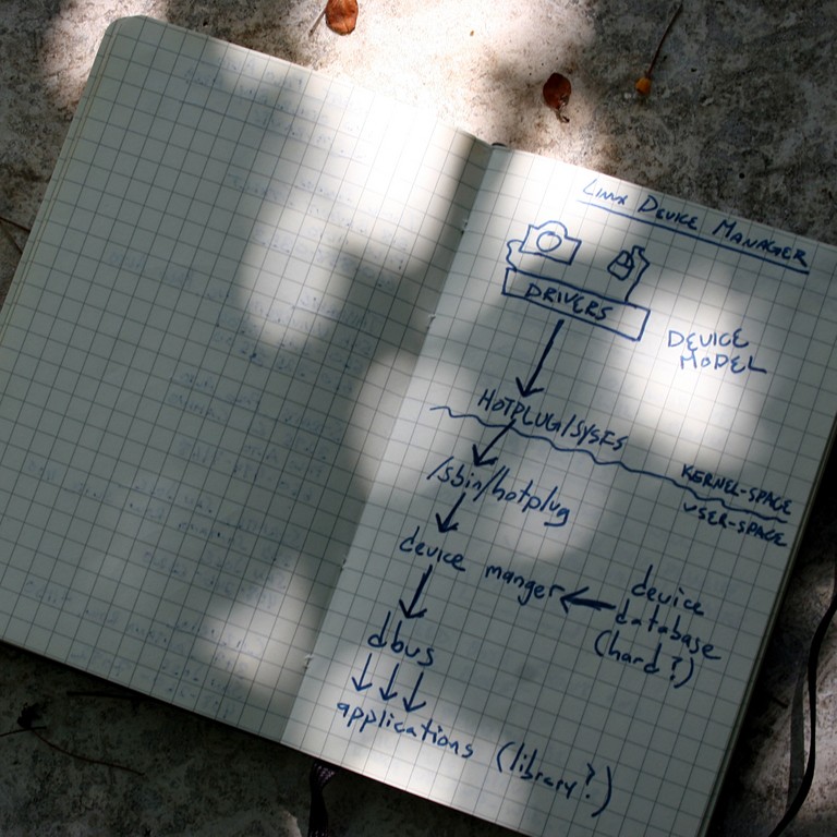 This was 2003. That summer, I attended a BOF at the Ottawa Linux Symposium on improving the Linux desktop by Robert Sanford Havoc Pennington. In the BOF, Havoc referenced a whitepaper of his entitled “Making Hardware Just Work”, in which he unveiled a utopian view of hardware management on the Linux desktop. Intrigued, I took notes—see Figure 1.