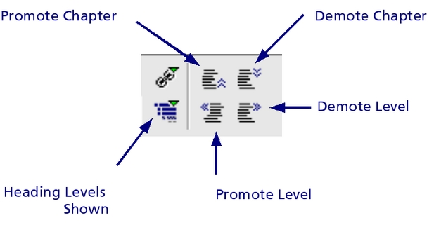 Figure 3. The Navigator's Outlining Buttons. Promote Chapter and Demote Chapter are on the top right; Promote and Demote Level on the bottom right. On the bottom left is Heading Levels Shown.