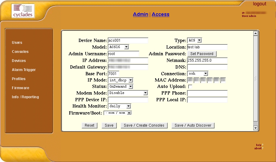 Cyclades also provided me with an ACS16 for this review. This device is a small Flash-based Linux box with 16 serial ports that can be used to connect to server consoles, modems, terminals or any other serial devices. Each managed device must have basic networking configuration and a root password set. This is done in exactly the same way as the APM—using an included serial cable and an interactive wizard. If you are planning on using the private network approach mentioned above, simply set the device to use DHCP and set the root password.