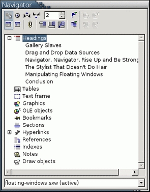 The Navigator is one of OpenOffice.org's strongest assets. As the name suggests, one of its main uses is for jumping around in a document, but don't be fooled by its name. In addition, the navigator also is an outliner, an inserter of hyperlinks and copies of text and the table of contents for master documents. You can open it by selecting Edit -> Navigator or by pressing F5.