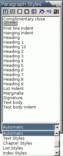Open the Stylist by selecting Format -> Stylist or by pressing the F11 key. Across the top of the window, you find buttons for changing the view, one for each of the types of styles you can use in Writer. From left to right, they are Paragraph, Character, Frame, Page and Numbering Styles. Once you select the type of style, you can filter the styles displayed from the drop-down list at the bottom. The default display of styles, Automatic, shows a selection of commonly used styles. Most likely, you want to change the display several times as you work. Some useful displays are: