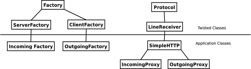Refer to Figure 1 for the class structure we are going to use. Instances of the Factory classes are used by Twisted to spawn off Protocol instances for each connection made. We create one SimpleHTTP class and inherit from it classes for managing incoming and outgoing traffic. Because HTTP is mostly the same for client and server, we can manage most of the lexical processing in one superclass and let subclasses do the rest, which is exactly how Twisted's own HTTP classes work.