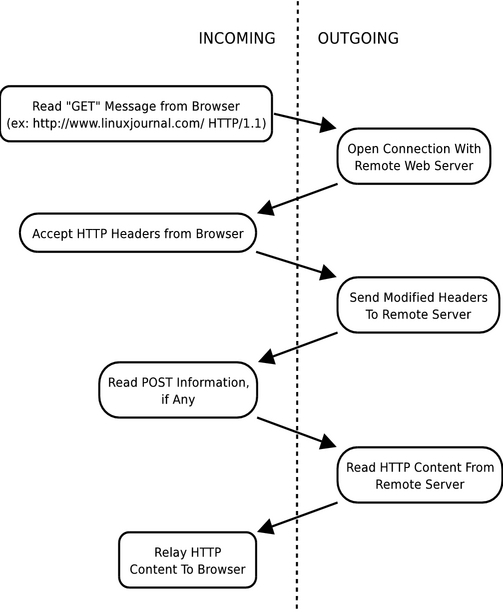 Operations you'd otherwise do with one or two methods tend to require several callback methods in event-driven programming. The rule of thumb is, any time there's a blocking operation you need to wait on, it happens outside your code and, therefore, between two of your methods. In the case of our proxy server, we can break down into separate chunks each part of handling a request. Most of what a proxy server does amounts to reading in data from a browser, making a few changes to that data and sending the modified data to the remote Web server. As of HTTP/1.1, multiple Web hits can be handled over one network connection. In Figure 2, you can see what happens to each request, keeping in mind that multiple requests can be made per HTTP connection. Arrows connecting boxes show which events are spawned and in what order.