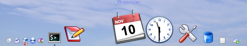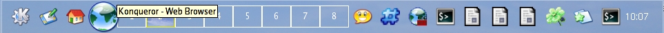 Start the program by running ksmoothdock. A window appears suggesting that KDE's default Kicker panel should be moved to the top, out of the way. The dialog offers to do it for you at this time. When the ksmoothdock program is running, everything becomes iconified, except the pager for the virtual desktops, including running tasks. The icons are the default icons for the applications.