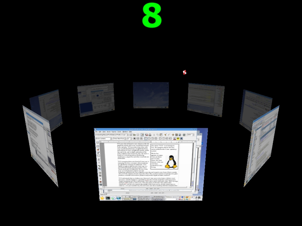 Running the program is a matter of typing 3ddesk. However, the first time, you should run the program with the --acquire option. Starting the program this way serves two purposes. The first is to see whether the server portion of the program (3ddeskd) is running and to start it if it isn't. The second is literally to acquire images of all of your current virtual desktops. A lot of people tend to run four virtual desktops. I run eight. This process takes only a second or two. Immediately after that, the magic happens and your 3-D switcher is running.