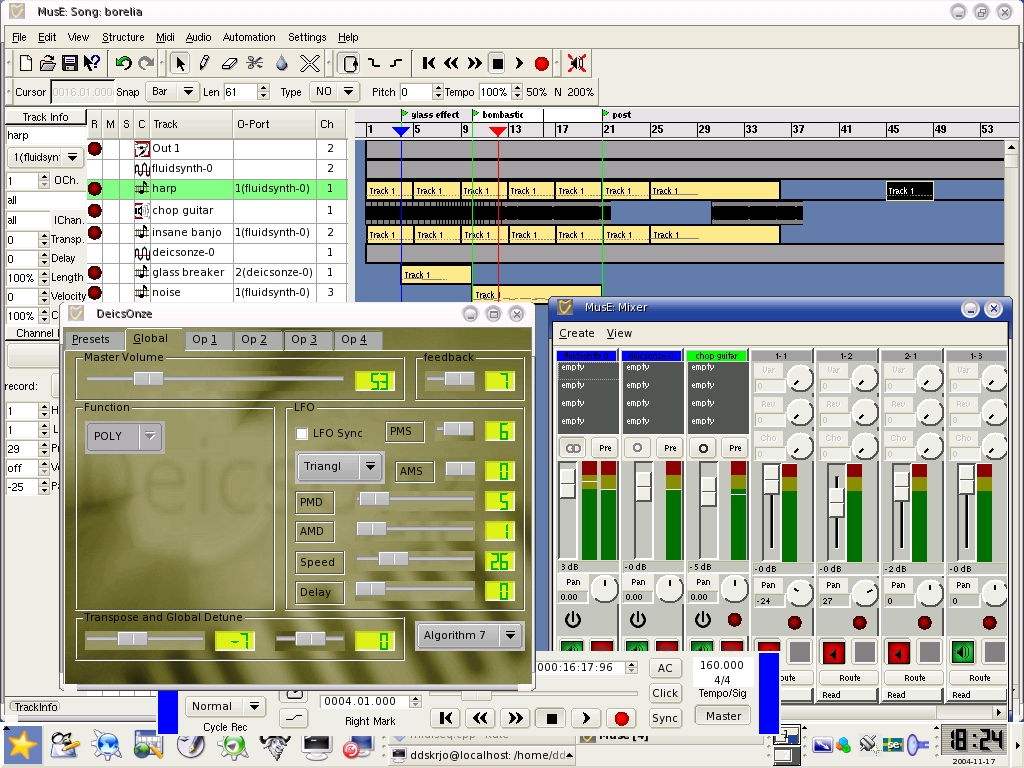 MusE's audio capabilities include support for LADSPA plugins as well as a native softsynth plugin interface--MESS, the MusE Experimental Soft Synth. Although the MESS API has not been used beyond MusE itself, it is a promising interface. You can see an example in Figure 4, a screenshot showing off Alin Weiller's DeicsOnze, a DX11/TX81Z emulator running as a native MusE softsynth.
