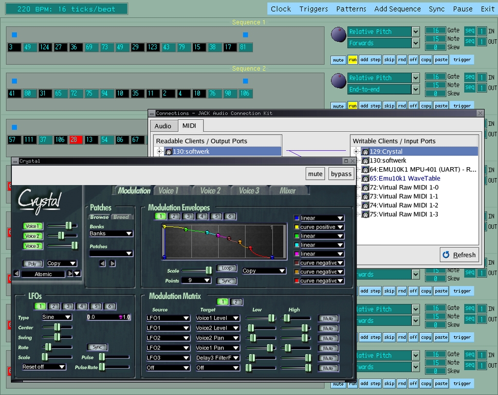 Figure 6 demonstrates SoftWerk at work with the Crystal VSTi plugin running under the libfst system. This is another gift from Paul Davis and Torben Hohn that enables the use of VST/VSTi plugins under Linux.