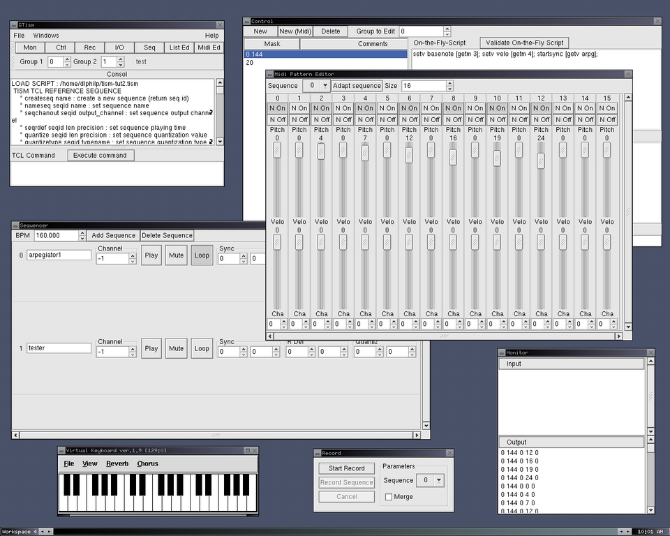 TiSM is Samuel Dufour-Kowalski's Temporal Information Sequencing Machine, a real-time MIDI sequencing environment based on the Tcl programming language. TiSM differs greatly from the other sequencers presented here, requiring the user to learn how to compose scripts in Tcl (an easy language for beginners) that control the sound production of a MIDI system.