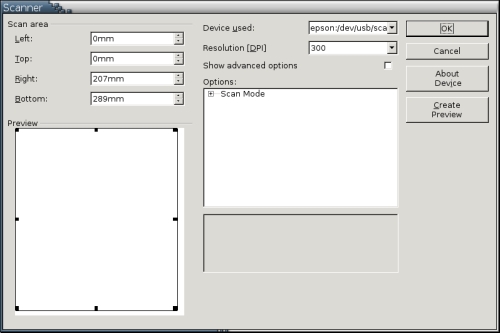 When you are ready to do the scan, select Insert -> Graphics -> Scan -> Request. After a few seconds' delay, the scan begins. The result is embedded at the mouse cursor.