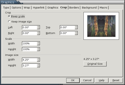 Fortunately, Writer provides all the controls necessary for fine-tuning the size of graphics. By selecting Graphics -> Tab from the right-click menu, you can use the Original Size button to display a graphic or object at its actual size or set the display to the size you actually want, using actual dimensions or a percentage of the original size. On the Crop tab, you not only can do similar scaling, but you also can change the amount of the object that displays from the left, right, top and bottom. Cropping is especially useful when inserting a Draw file, which has no way to crop except by adjusting the page size, which often consequently leads to large amounts of white space.