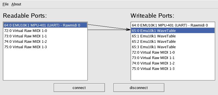 Some of the screenshots in this series already have shown off the MIDI connections panel in Rui Nunez Capela's QJackCtl, an all-purpose GUI for connecting clients of the JACK audio server and the ALSA MIDI sequencer. Other graphic interfaces for connecting ALSA sequencer clients include Bob Hamm's ALSA Patch Bay (Figure 10), Matthias Nagorni's KAconnect (Figure 11) and Maarten De Boer's aconnectgui (Figure 12).