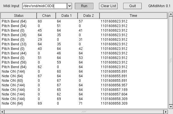 At some point, almost every serious MIDI musician needs to monitor a MIDI data stream, perhaps to diagnose a malfunctioning piece of equipment or to examine the contents of a MIDI sequence during playback. Samuel Dufour-Kowalski's GMidiMon is just the tool for that job, providing a simple GTK interface for displaying MIDI messages in a human-readable form (Figure 13). Alas, at this time GMidiMon doesn't support sysex messages, but the program works well when displaying any other MIDI message types.