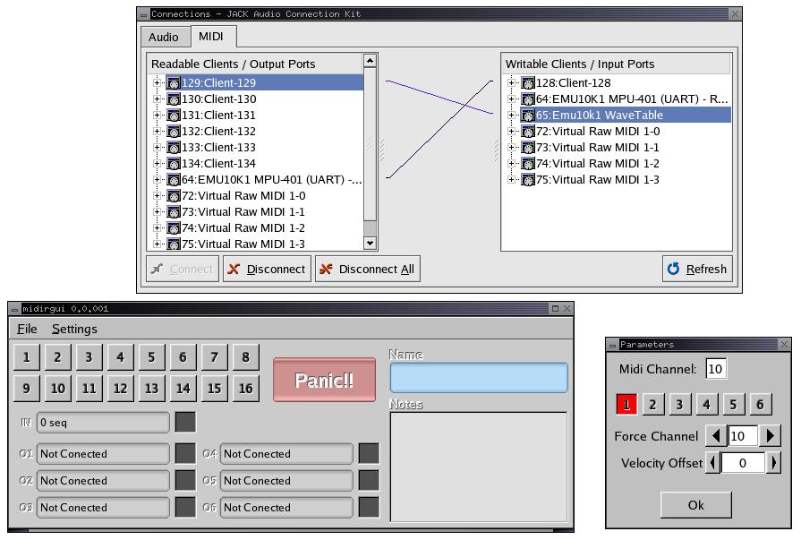 Midirgui takes an incoming MIDI data stream and distributes it to any of six output cells, each of which is an ALSA sequencer client. You can filter the channels allowed to pass through each cell, a huge help when you want to access only a single patch or sound on a device that always is in Omni Receive mode, meaning it receives MIDI on all channels. Thus, by setting one of the cells to pass MIDI messages on channel 10 only, I'm able to use the drums on my SBLive Emu10k1 synthesizer while playing other synths. Figure 5 demonstrates the necessary connections: an external sequencer sends out a multichannel MIDI stream and is connected to midirgui, client 128 in the JACK MIDI patch bay input ports). Midirgui's first cell, client 129, filters the data flow and sends only messages on channel 10 to the Emu10k1.