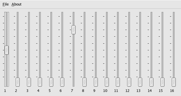 QMidiControl (Figure 8) is a simpler utility. In its default configuration QMidiControl displays a bank 16, numbered sequentially 1 through 16. The number of faders in the bank can be increased with the --num_controller option, and the initial numbering can be offset with the --offset flag. QMidiControl is indeed a simple program, representing only the numbered MIDI controllers--that is, no sysex or pitch bend--but you may find it quite helpful if your synthesizer responds to MIDI controllers but lacks the physical knobs and sliders. QMidiControl is useful especially when configured for use with Dr. Nagorni's QAMix, a MIDI-controllable soundcard mixer.
