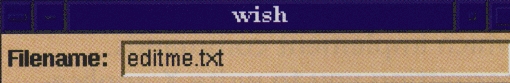 The second line creates an entry widget, named .e. An entry widget is like a label, except that it allows the user to edit the text. The -relief sunken option indicates that the widget should appear as though it is “recessed” in the window, as you can see in Figure 2. The -width option sets the width of the entry widget in characters, and the -textvariable option indicates that the value of the entry text should be stored in the variable fname.