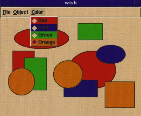 The Color menu is like the Object menu: We have four radiobutton entries linked to the variable thecolor. We use the -background option with these entries to visually depict the color being selected.