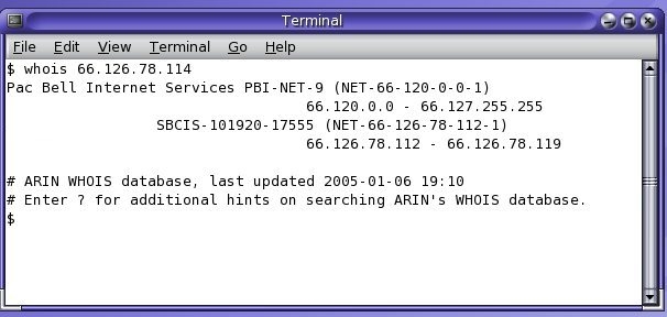 In this particular case, I decided to track down the person attempting to break into our system. Using a program called whois, I found the origin of the IP address owner. Figure 1 indicates that the perpetrator used PacBell as an Internet provider and that the IP address owner has a range of address from 66.126.78.112-119.