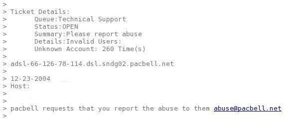 So, I filed a report with our ISP, who took our logs and verified that an attempt was made to break into our system. From there, the issue went to the ISP's compliance office, which contacted PacBell. In Figure 2, you can see an excerpt from the e-mail I received.