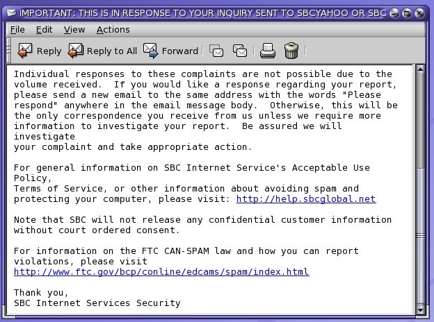 First, your infrastructures may be exploited. As shown in Figure 3, the ISP says, "Individual responses to these complaints are not possible due to volume received." Consider that another way of saying, "we cannot stop the abuse because too much exists". Also notice that the e-mail says, "Note that SBC will not release any confidential customer information without court ordered consent." Consider that another way of saying, "we will not tell on our customer".
