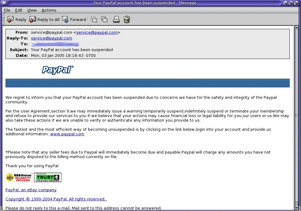 In this figure, you can see what appears to look like an alert from a well-known provider of e-commerce transactions, PayPal. Anyone with a PayPal account simply could click the Web site address provide to find out what the problem might be with his or her account.