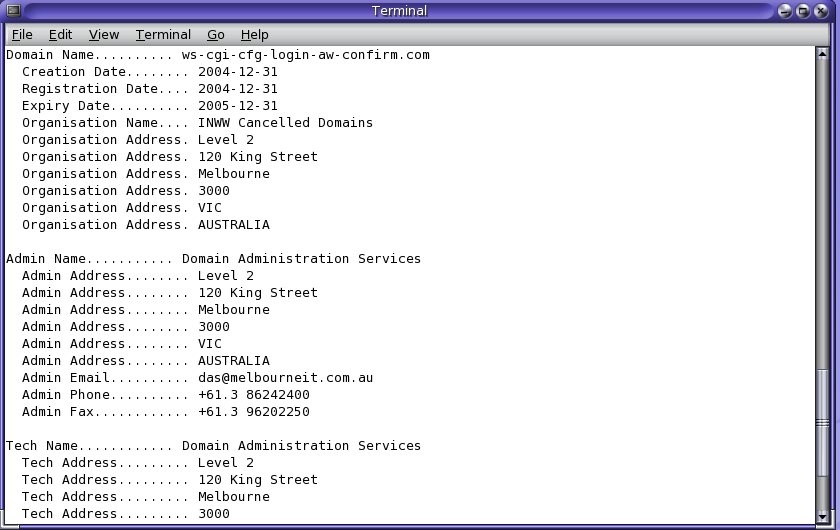 We performed a whois on the URL and discovered a domain registered to someone with a set of jumbled letters as a name and address. After reporting the scheme to PayPal, the company contacted the issuer and took control of the URL. Figure 6 shows the domain registration after the report.