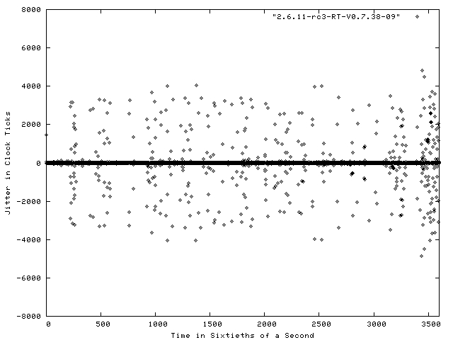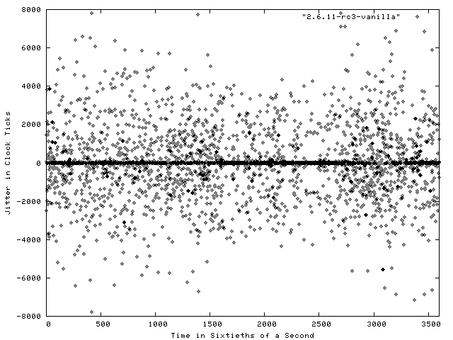 Figure 1 shows a plot of the results of the Realfeel benchmark run on a stock Fedora Core system for a period of one minute. The system was running kernel version 2.6.10-1.760_FC3, which is a 2.6.10 kernel with various patches and enhancements applied by Red Hat. Each dot in the figure represents the jitter between an interrupt request and its handling. The X axis is the sample time in 1/60 of a second. Negative jitter numbers are displayed when the system responded to the interrupt faster than the projected standard time. As you can see from the figure, a fair number of these interrupt requests were handled exactly as expected, resulting in a visibly dark line along the 0 value of the Y axis.