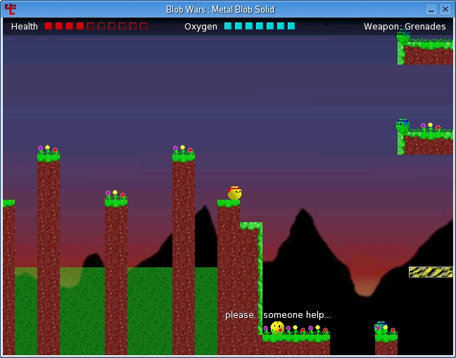 To play, launch the command blobwars. When the game starts, you are presented with a menu from which you can start a new game or continue one already in progress. The Options menu lets you switch from windowed to full-screen mode. You also can adjust the volume of both the sound and music track, as well as the brightness level. In addition, you can decide whether you want to have the blood and gore turned on. Yes, as you fire on enemy blobs, they scream and explode into a bloody fireworks display. Sure, it's a little over the top, but the game is great fun. Really.
