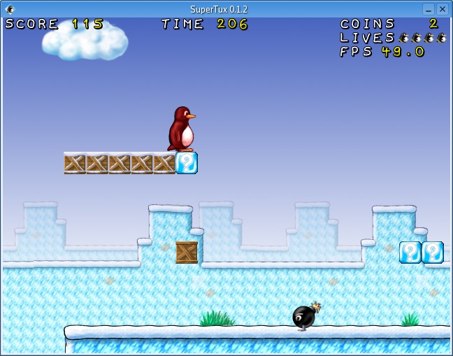 The story goes like this: Tux and Penny (Tux's love interest) are out on a nice date when Tux is knocked out and his lovely Penny is penguinnapped by the evil Nolok. Held prisoner in Nolok's equally evil fortress, Tux must brave all sorts of perils to save his lovely lady. It is your job to help Tux succeed in his quest (Figure 3).